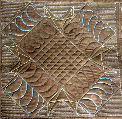 This was more challenging to quilt...not a lot of open space. Rather than trying to follow the design on these blocks, I opted for some linework--both curved and straight.