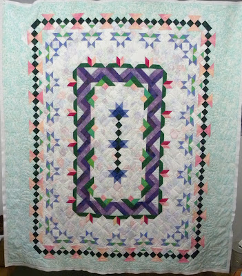 Its a colorful and HUGE quilt. I knew that I would be doing a lot of intensive quilting in the brown areas, so the borders got some simple line work. In the outer brown area I did a combo of leaves, paisley's, and pebbles surrounding the leaves and filling in the background.